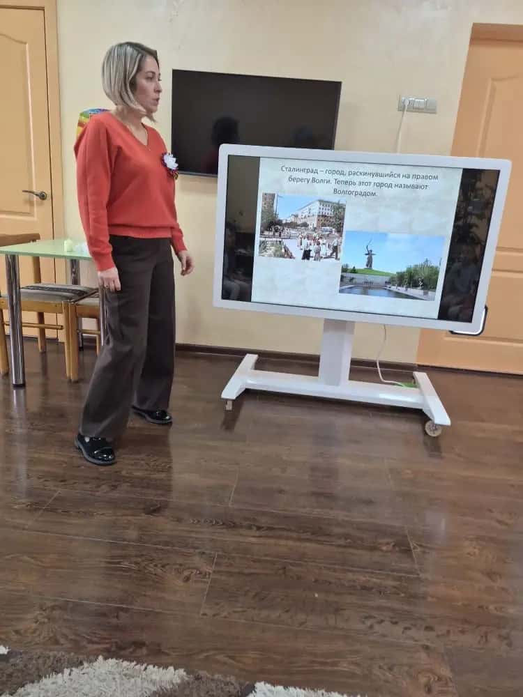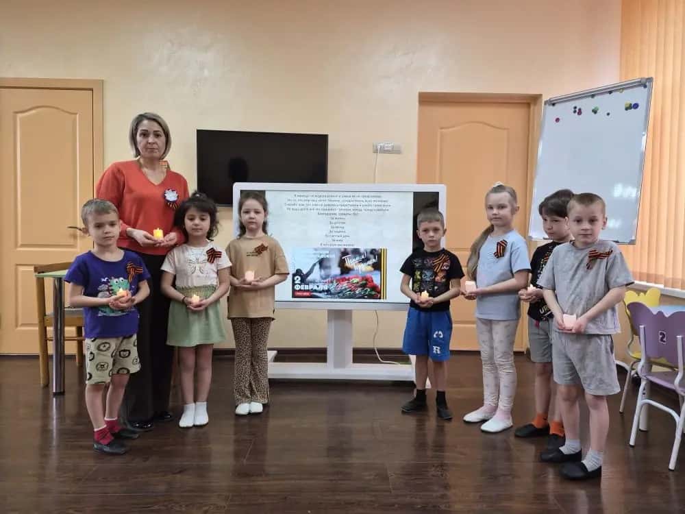 В старшей группе "Солнечные лучики" прошло тематическое занятие. Воспитатель, Ольга Алексеевна, познакомила ребят с важной исторической датой, рассказала о городе-герое Сталинграде, об исторических фактах Сталинградской битвы, об ожесточённых боях и героизме советских солдат, о значении города на Волге для фашистов и нашей страны, о тяжелом положении мирных жителей, об обугленной пожарищами и обильно политой кровью земле Сталинграда, Мамаевом кургане. Ребята узнали, что Сталинград – так назывался Волгоград во время Великой Отечественной войны.